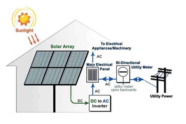 Solar panels mounted on the rooftop convert solar power into usable DC electricity. This DC power